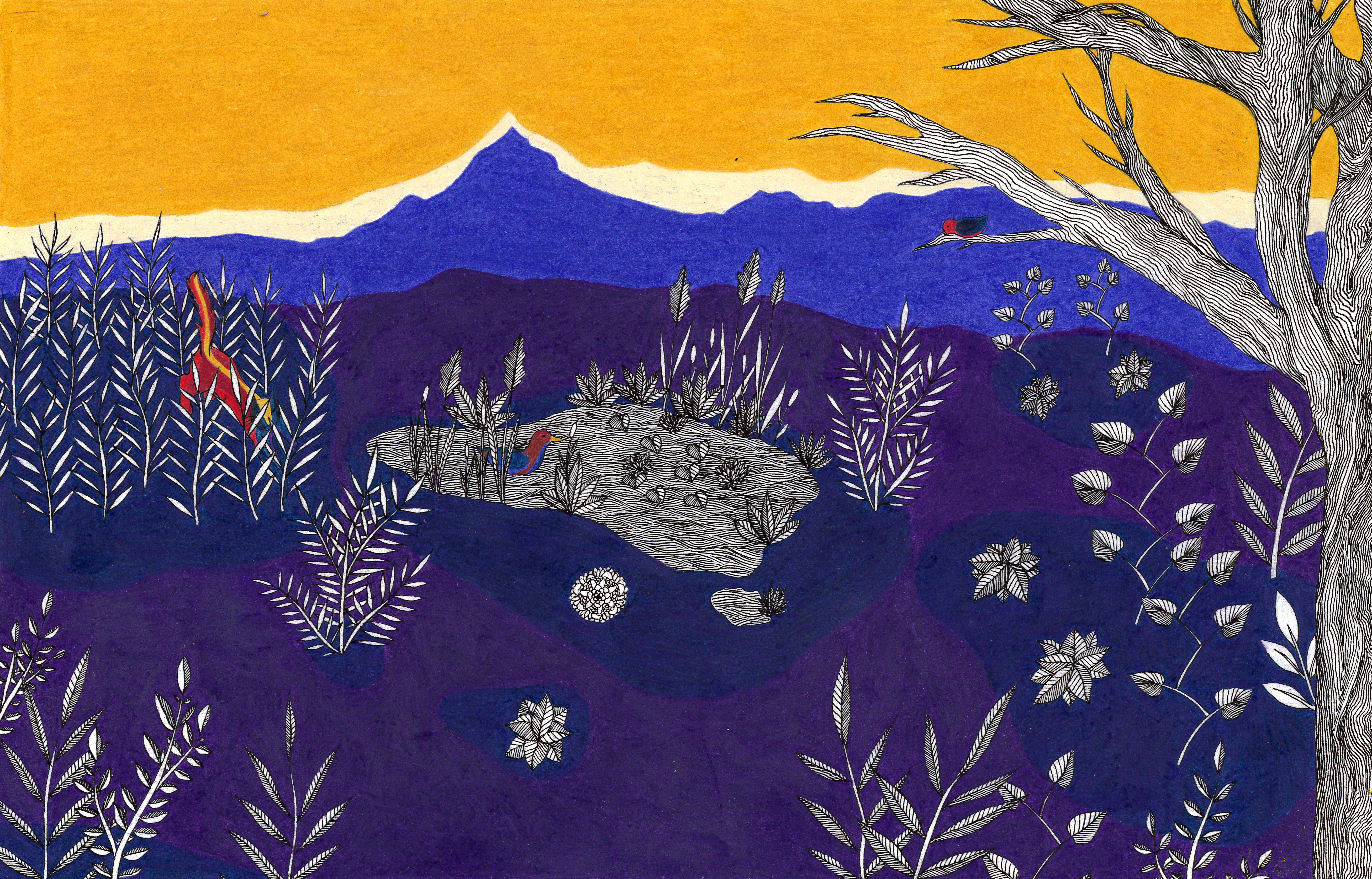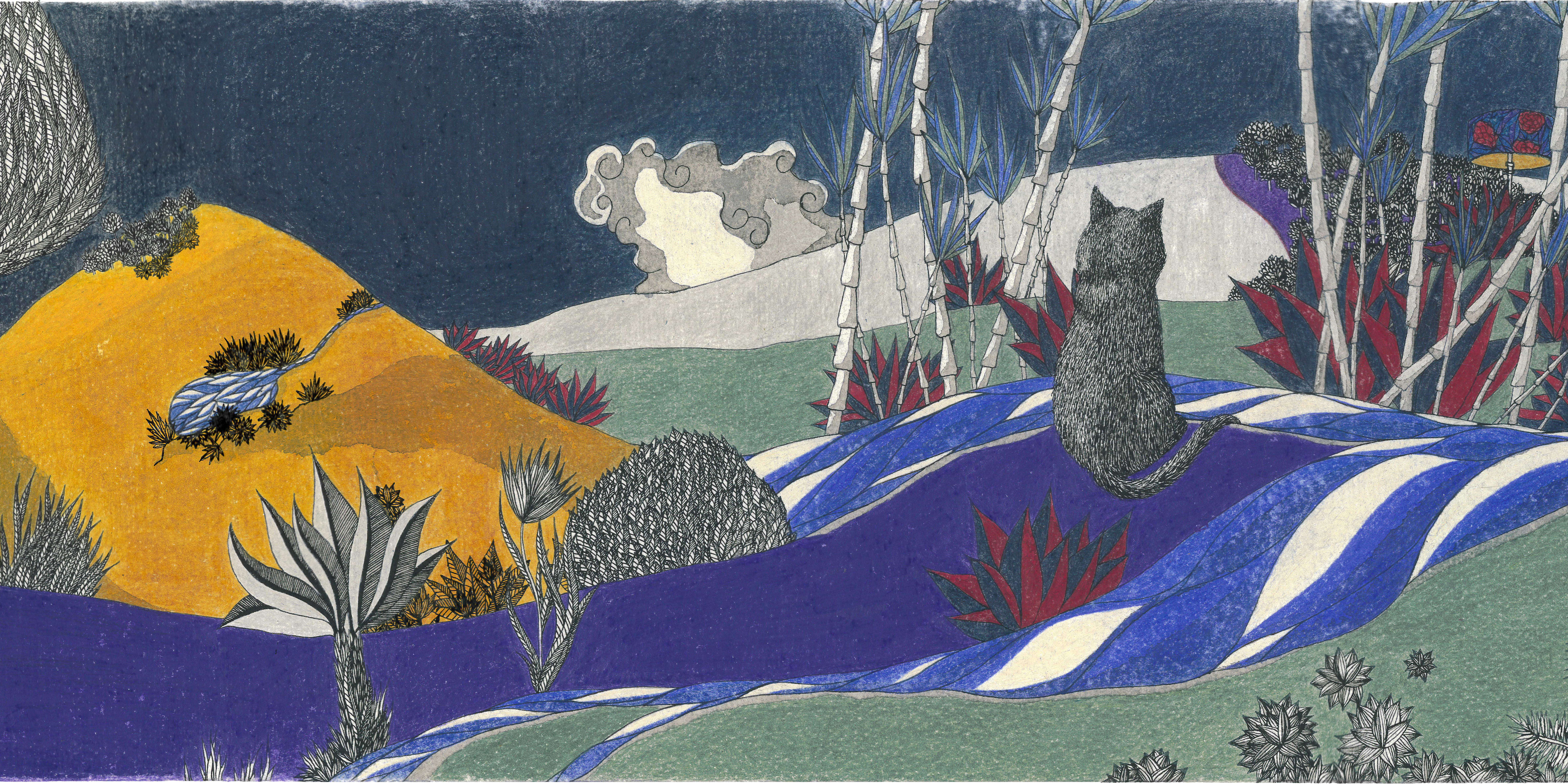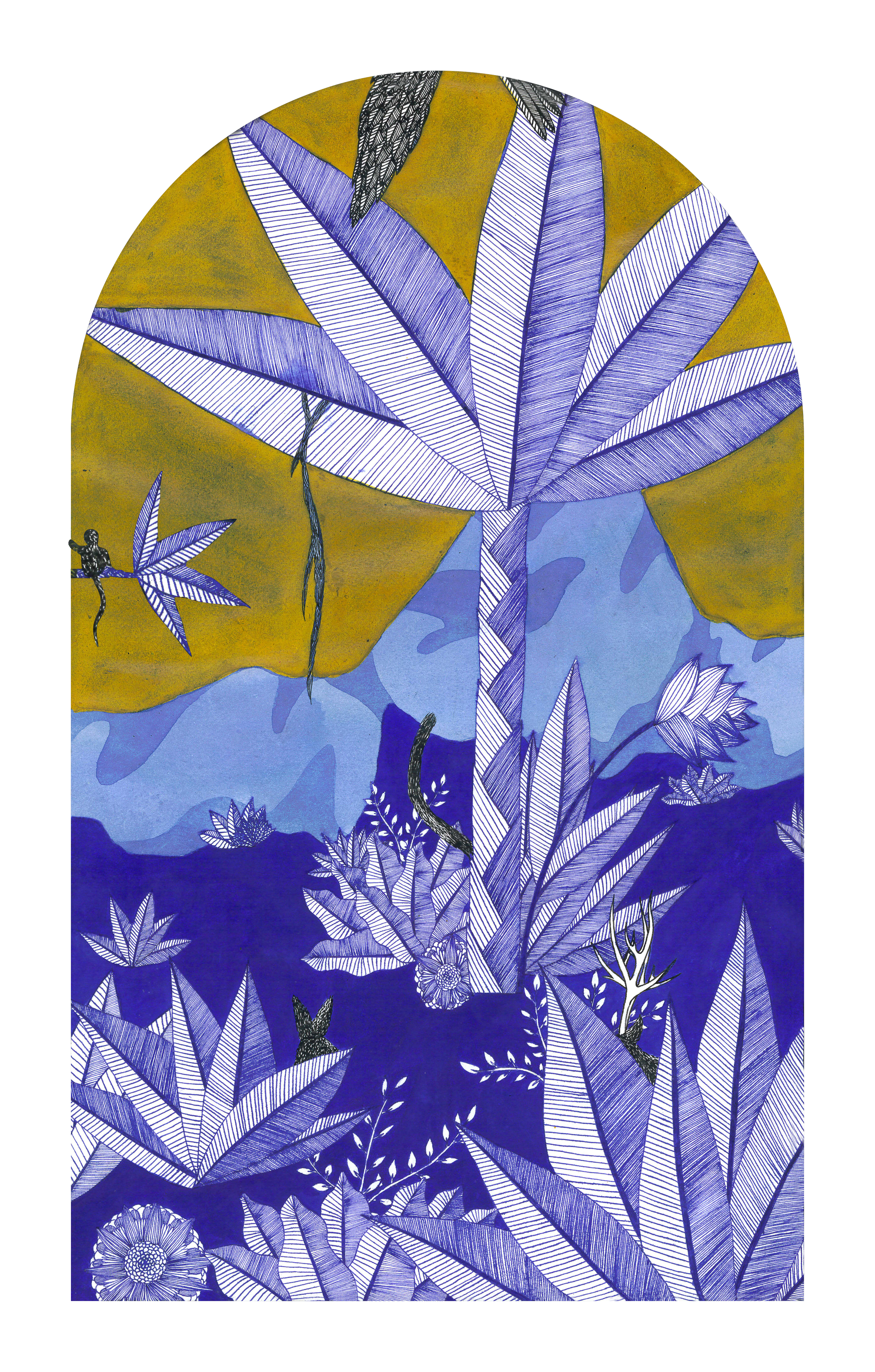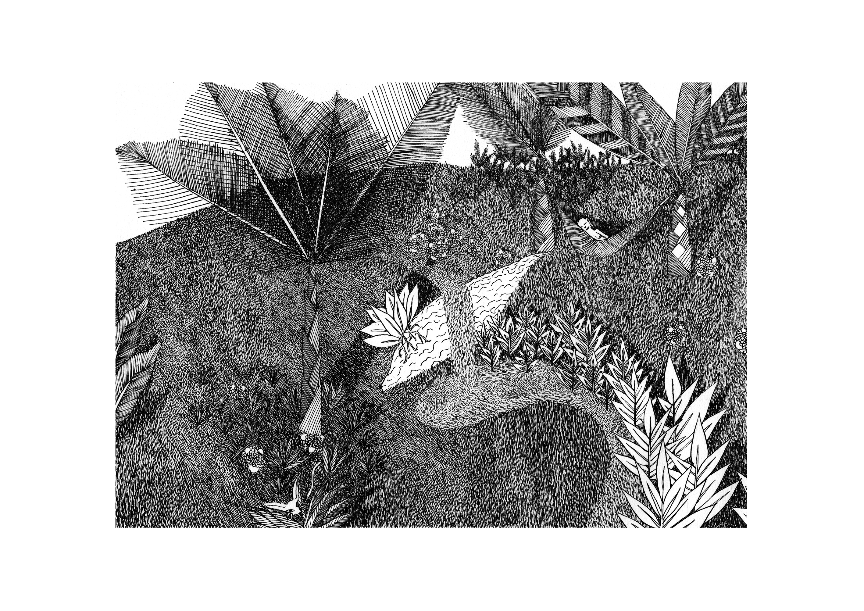 Sur le bord du paradis – 46cm x 55 cm – encre de Chine, crayons de couleur – VENDUE
