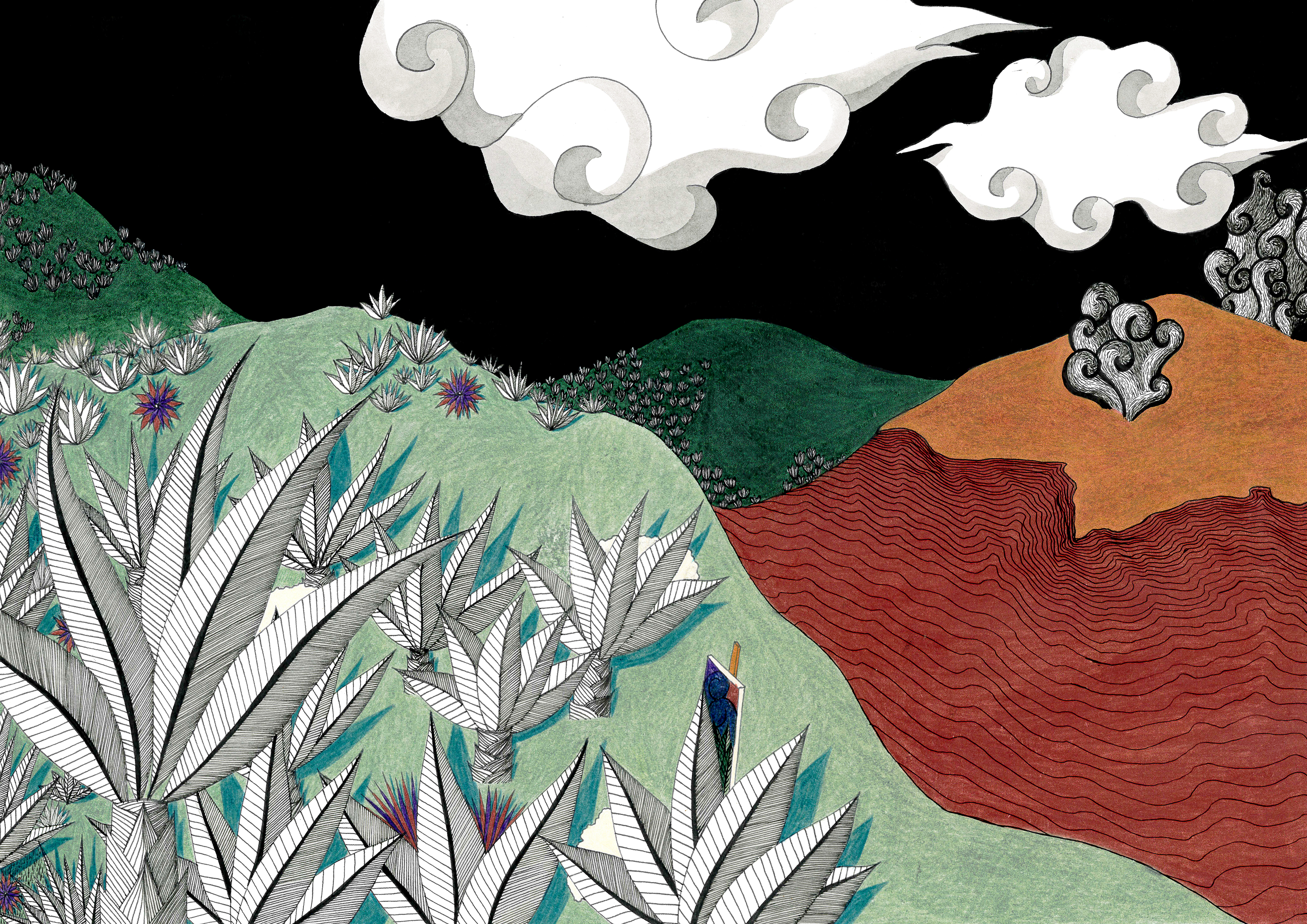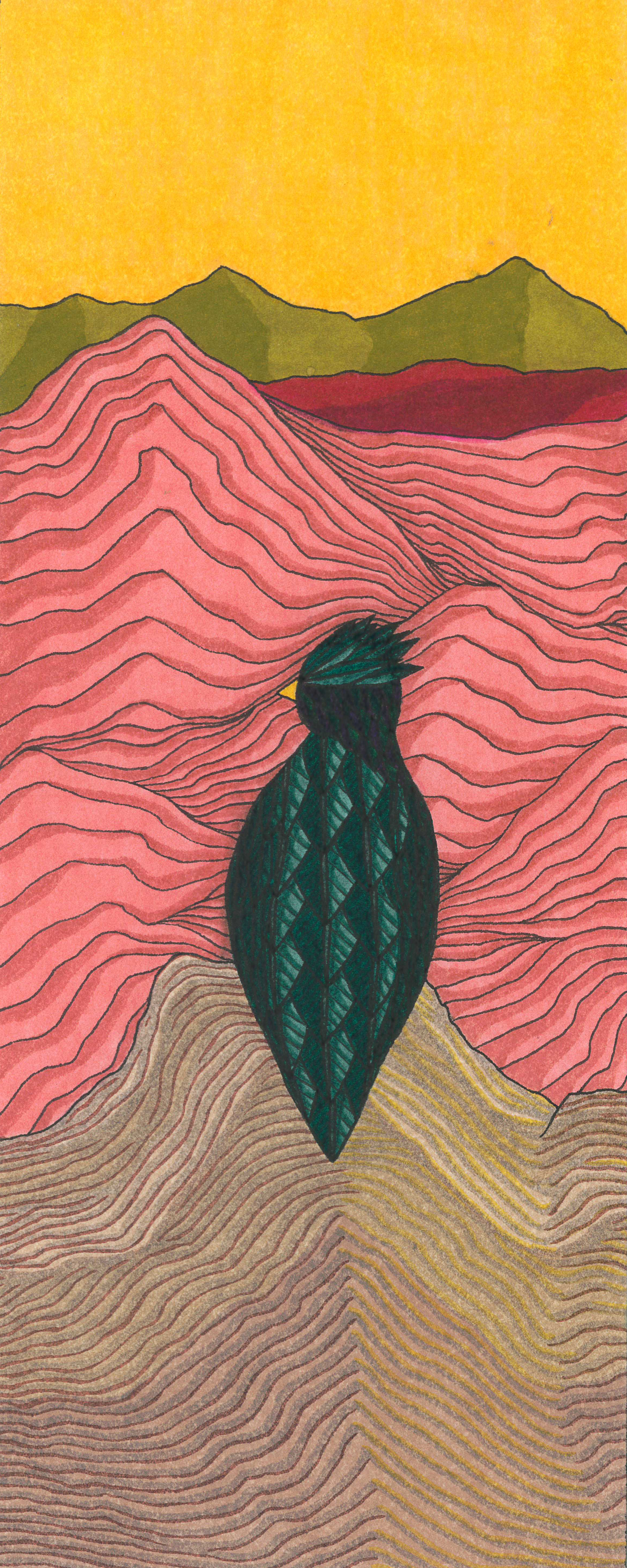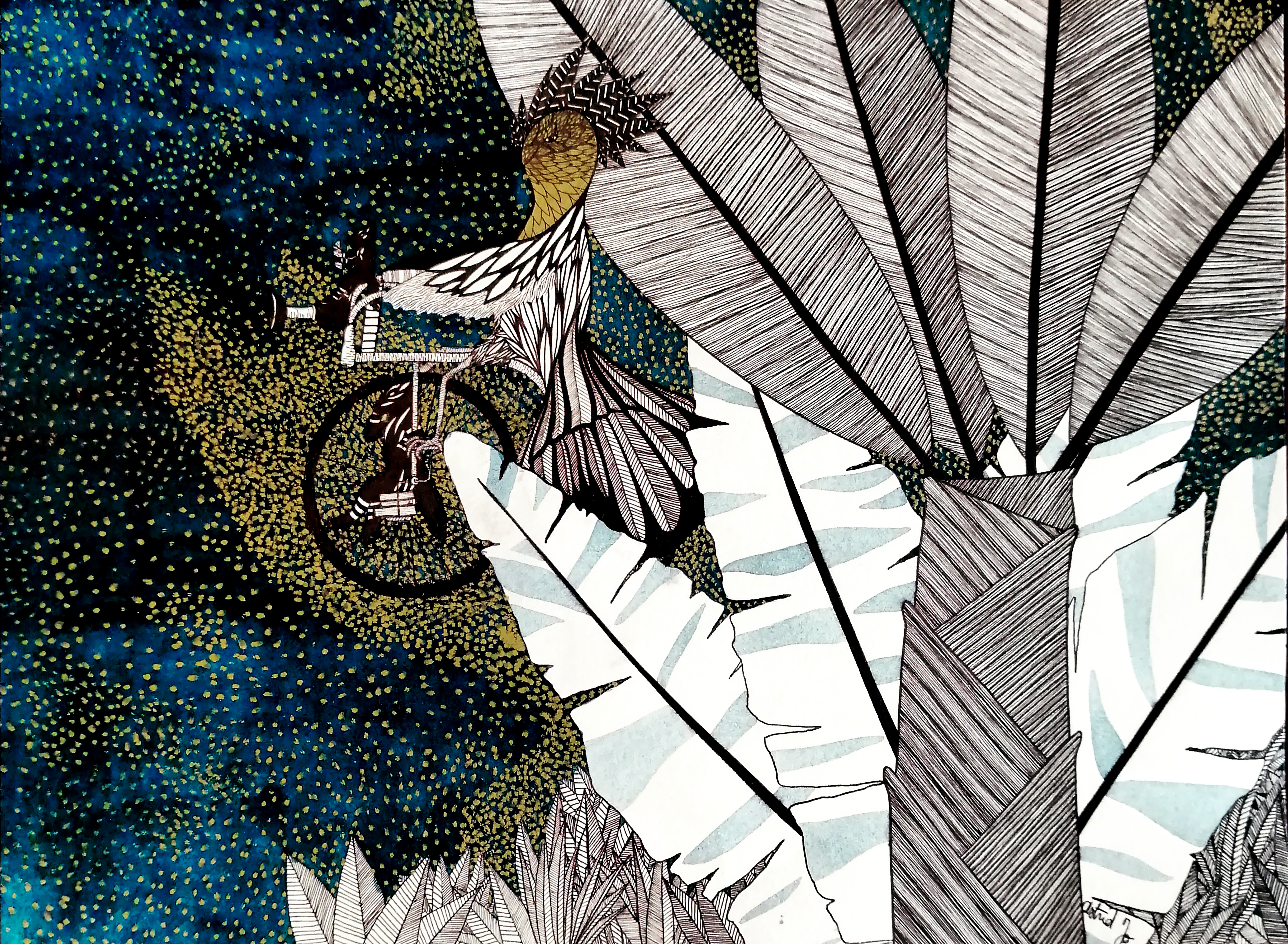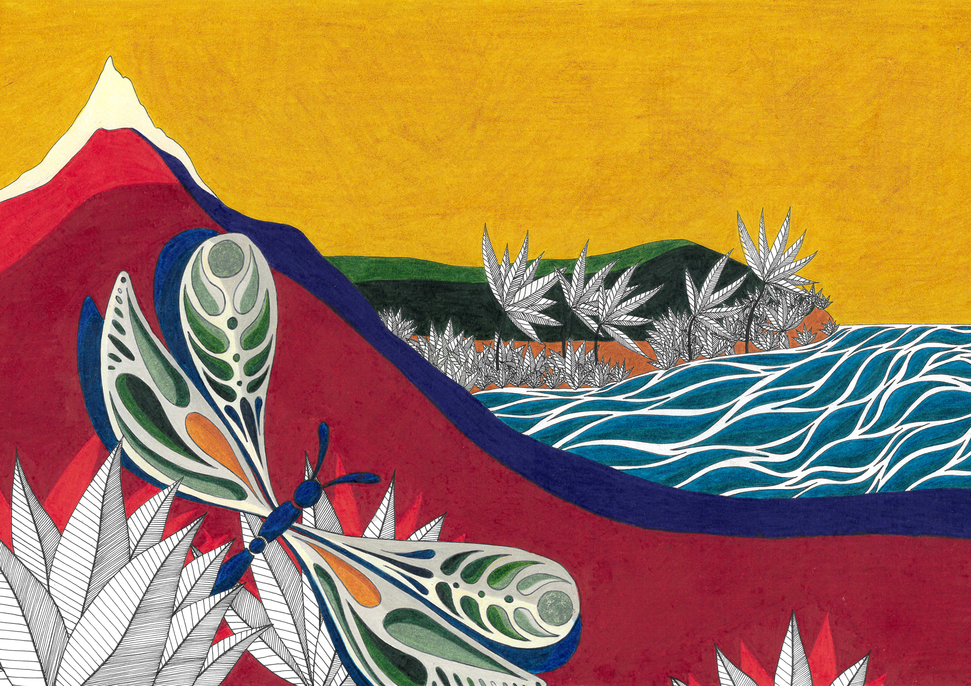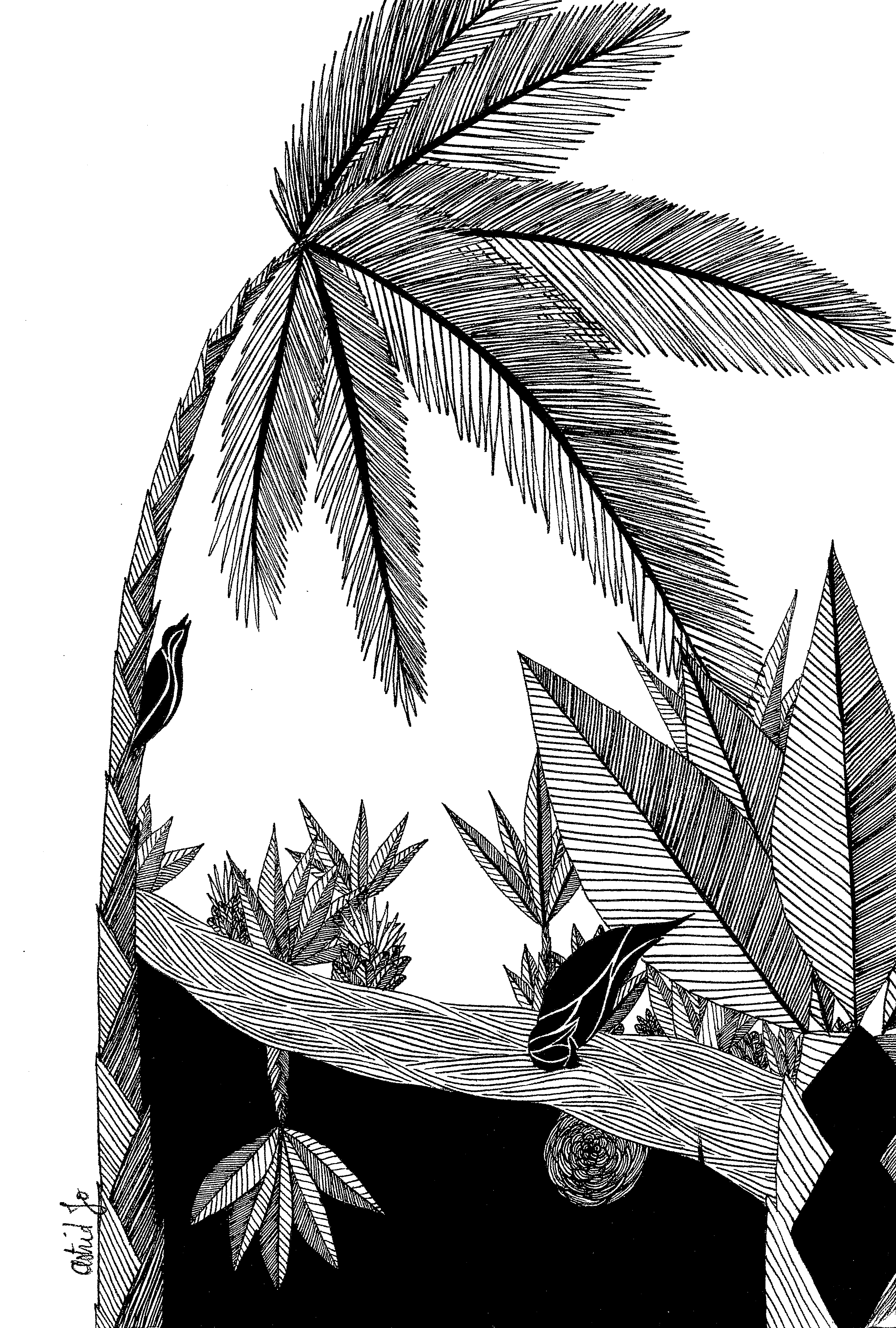 Sur le bord du paradis – 46cm x 55 cm – encre de Chine, crayons de couleur – VENDUE